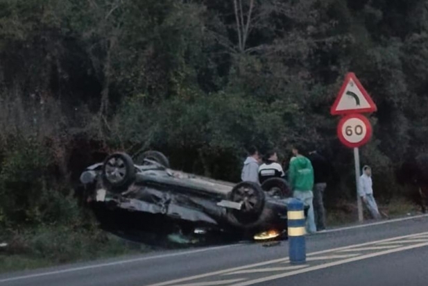 Com a conseqüència de la col·lisió de tres cotxes, un ha quedat bolcat a l'altura de la deixalleria